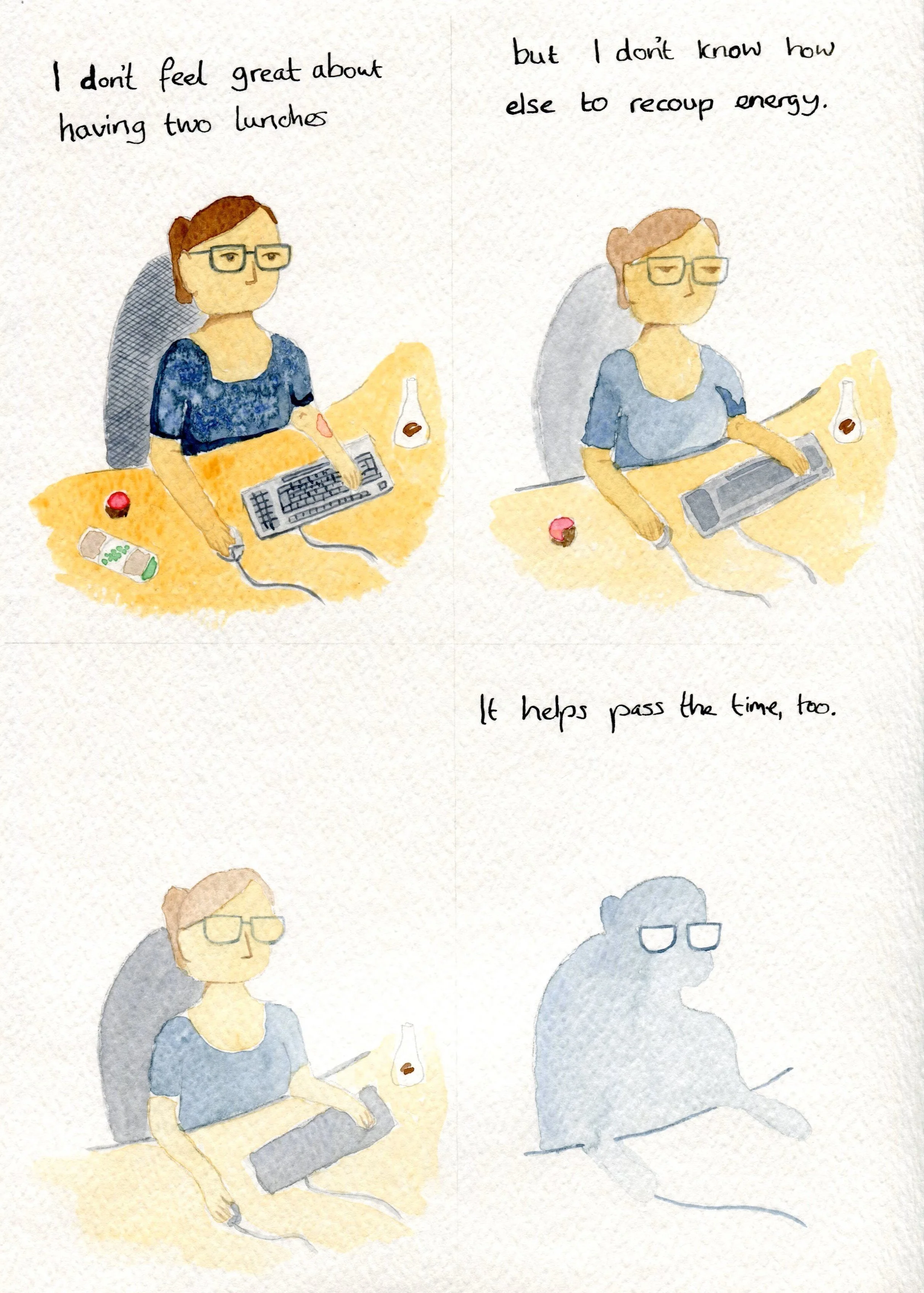 A watercolour sketch comic of my experience working in an office. I was trying out ideas for a memoir about my life before and during the plague times, recording how working in an office as an undiagnosed, unaccommodated autistic person was actually a bit awful at times and how the sudden hush that descended during the pandemic allowed me time to heal my mental health. It felt wrong though, to talk about an emergency that brought pain and death to so many as a positive experience.